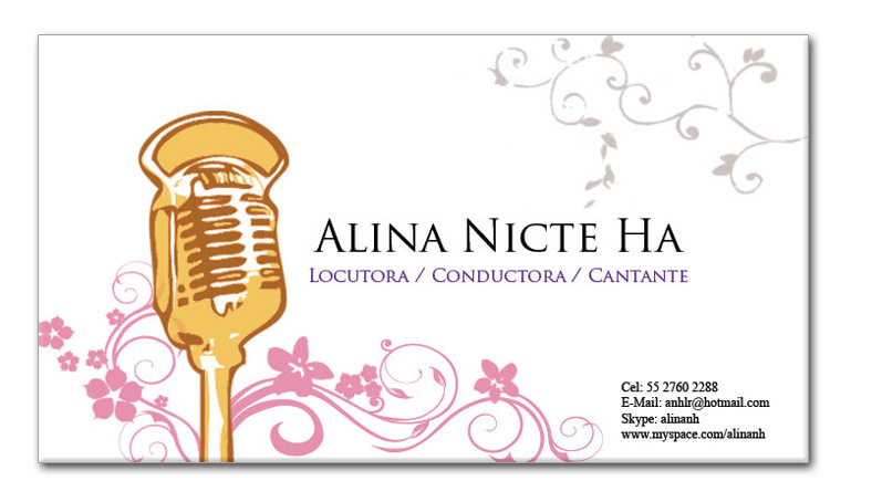 Diseño Gráfico Tarjeta Locutora Alina Xochitlquetzal Atilano 5 agosto, 2006 Cliente: Locutora Alina Nicte Ha Proyecto: Tarjeta de presentación personal con vectorización de objetos (elegidos por el cliente). Selección de color. Año: 2009